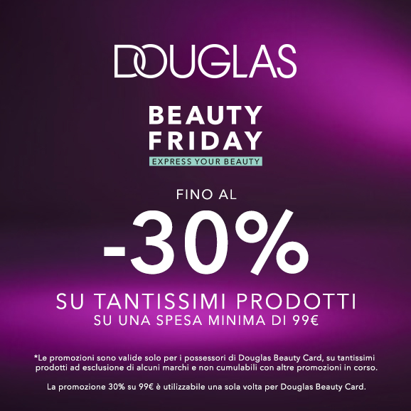*Sconto del 25% su una spesa minima di 69€ e 30% su 99€. Le promozioni sono valide solo per i possessori di Douglas Beauty Card, su tantissimi prodotti ad esclusione di alcuni marchi e non cumulabili con altre promozioni in corso. La promozione 30% su 99€ è utilizzabile una sola volta per Douglas Beauty Card.