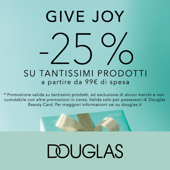 *Sconto del -25% su 99€ valido su tantissimi prodotti ad esclusione di alcuni marchi e non cumulabile con altre promozioni in corso. La promozione è valida solo per i possessori di Douglas Beauty Card. Per maggiori informazioni vai su douglas.it
